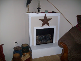 Another thing I've been working on is the fake fireplace hubs made for me last year. I wanted a floor level surround but he couldn't quiet grasp that concept and made the firebox up off floor level. So I had him make alterations to it and add a hearth. It will do for now till I have time to make the one I really want. It still isn't finished either, it needs the top trim put on and paint touch ups here and there, and a hole drilled for the electric logs cord. I'll also share more pics as it comes together. And if you look closely at the bottom left in front of the firkins, you'll see my "saltbox thermostat cover" I'm working on too! Don't have the top (roof) painted or the house design, but of course will be sharing all these things as they get done.